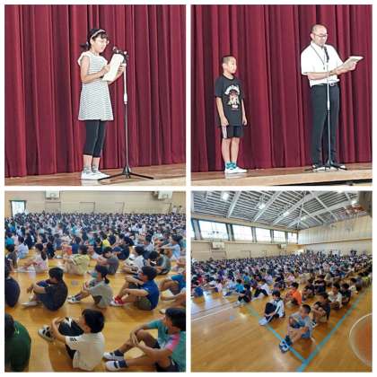 児童代表の言葉は5年生です。1学期にがんばったことや、音楽会に向けての抱負をしっかり伝えていました。素晴らしいです。応募クラブで初めて入賞した4年生の表彰も行いました。