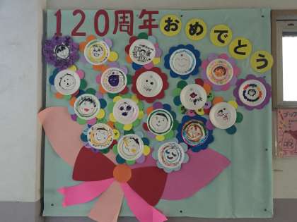 玄関の掲示は過去の周年記念の写真パネルを掲示しています。