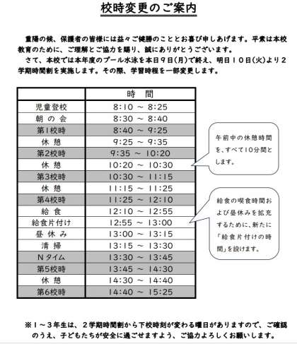 時間割も変わりました。1年生の5時間目は14:30までとなり、月曜が4時間目までとなります。2年生は火曜、3年生は金曜が6時間目までとなります。ご確認よろしくお願いします。