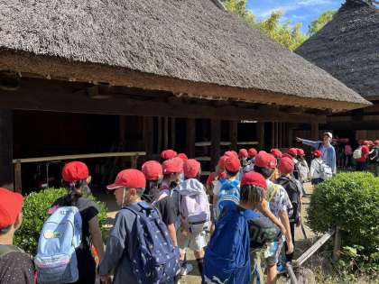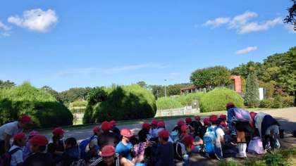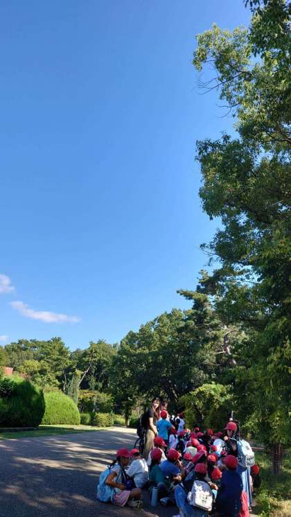 服部緑地に着きました。青空がとてもきれいです。休憩したあと、古民家集落へ向かいます。