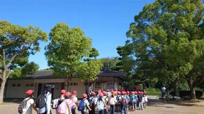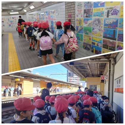 今日は2年生の遠足です。晴天に恵まれて、元気に学校を出発しました。地下道では長居小学校のみんなが描いた「すみちゃんの絵」が飾られていました。その通路も、長居駅のホームも、きまりを守って上手に歩けました。