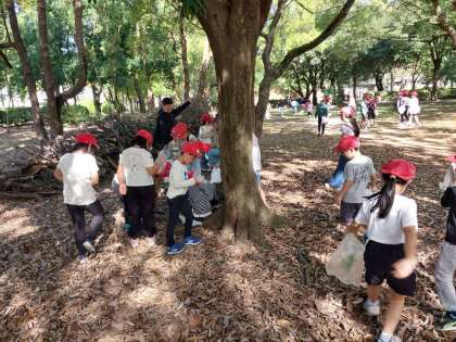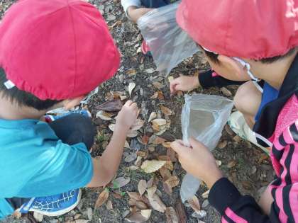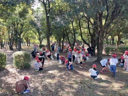 公園内でどんぐり探しの始まりです。今日の目標は20個! できるだけ乾いていてトゲの無いものを探します。