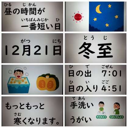 オンライン朝会で冬至の話をしました。今年の12月21日は、太陽が出ている時間が一番短い日です。