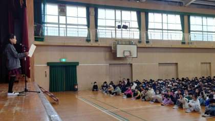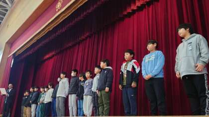まず、4年生の代表児童が新年の抱負を発表しました。力強い言葉に、多くの児童が心を動かされたことでしょう。また、ミニバスケットボールクラブが府の大会で見事5位という成績を収め、表彰を行いました。
