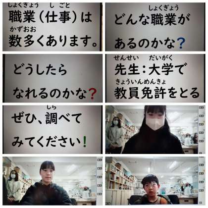 オンライン朝会では、「将来なりたい職業」のアンケート結果をもとに、「どんな職業があるのか」「どうすればその職業に就けるのか」について話をしました。