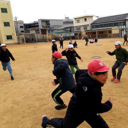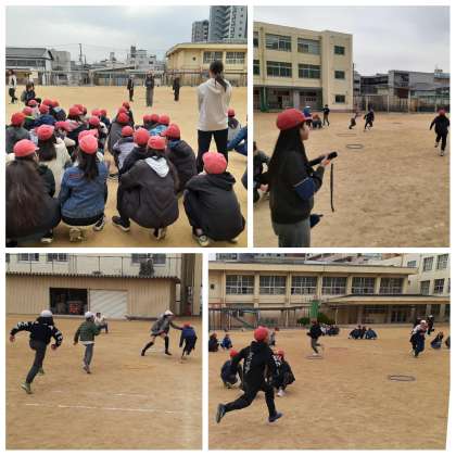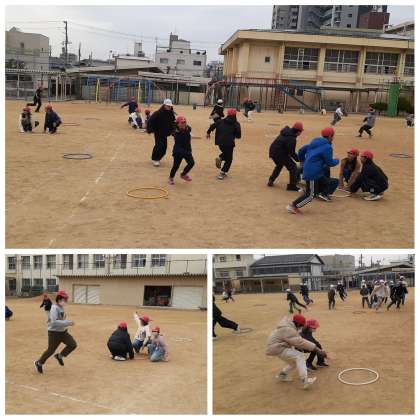 運動委員会では、学期に1回、みんなが運動に親しめる企画を考えています。3学期は「いろおにごっこDAY」を実施することになりました。ルールは、白帽のおにが「青色!」と言うと、赤帽の子どもたちは青色のフラフープにタッチするというものです。本日の5年生は、1つのフラフープにタッチできる人数を4人までと制限し、より戦略的に楽しめるよう工夫していました。子どもたちは夢中になって体を動かし、運動の楽しさを実感していました!