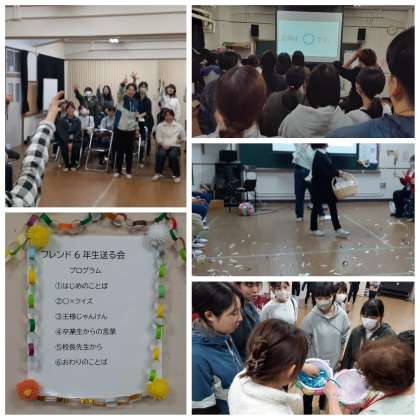 保護者の皆さんと教職員が一緒にお祝いしました。まず、○×クイズと王様じゃんけんで会場は笑顔と歓声に包まれ、勝者には6年生手作りの雑巾が贈られました。続いて、卒業生一人ひとりが小学校の思い出と未来への決意を語り、保護者の方々からも心に響くメッセージをいただきました。会場の飾りつけやくす玉は保護者の方の手作りで、温かな想いがひとつになった、心に残る素晴らしい会となりました。
