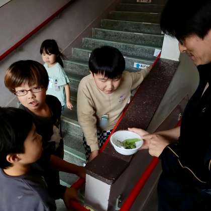 休み時間に、子どもたちがチョウの幼虫を理科の得意な先生に見せています。先生も一緒になってじっくり観察し、会話がはずみます。教室を離れても、こうした何気ないやりとりの中に学びの芽が育っています。