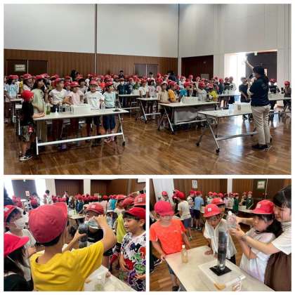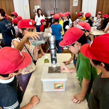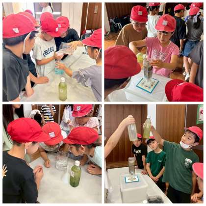 屋内では「オゾンの実験」と「粒状活性炭の実験」を行いました。水が変化していく様子に、子どもたちは驚いたり喜んだりして、歓声をあげていました。普段の生活ではなかなか見ることのない浄水の仕組みを、体験を通して楽しく学ぶことができました。