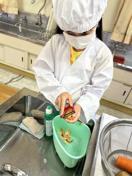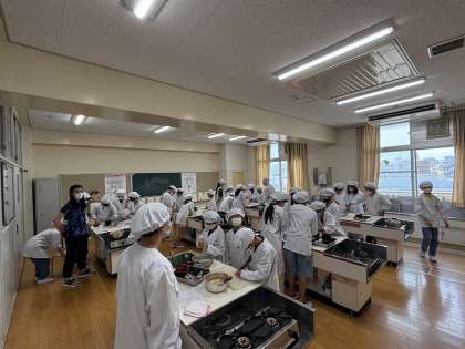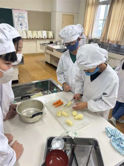 来月の臨海学習にむけ、野菜の切り方やゆで方について学習しました。