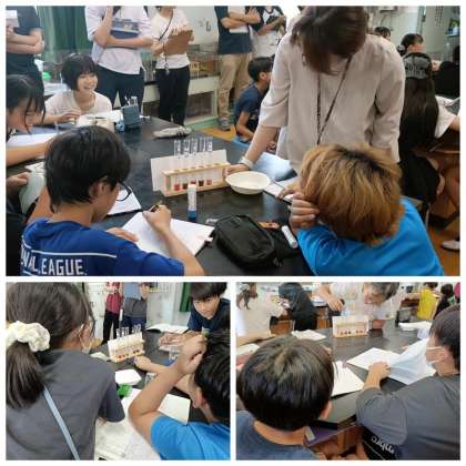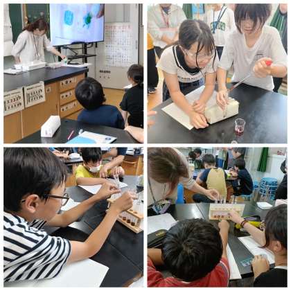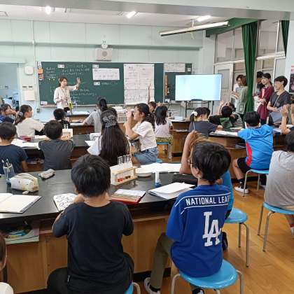 本単元では、理科専科の先生から担任の先生へと指導がバトンタッチされ、「水よう液の性質」について学びました。水よう液にぶどうジュースを入れることで、色の変化を観察し、仲間分けを行いました。教室中に「おお〜!」という驚きの声が広がり、見た目の変化から水よう液の性質の違いを感じ取ることができました。理科の楽しさを実感しながら、考察する力も育まれています。