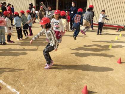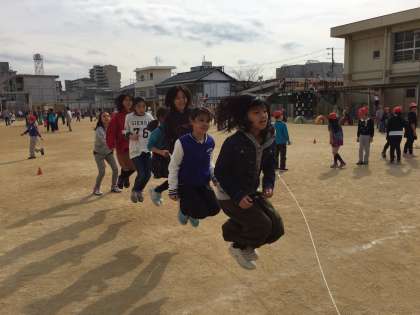 おおなわで記録に挑戦します。続けてとべた回数と中で跳んでいる人の人数を運動委員会の人が記録します。
