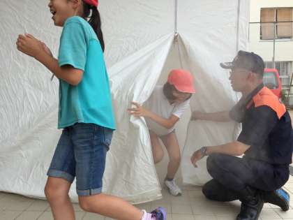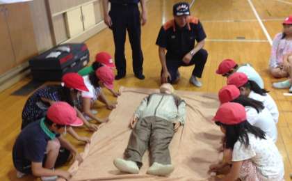 区役所・消防署の方にご協力いただいて。けが人の搬送訓練・けむりハウスの体験・水消火器による消火訓練・危険なことへの対処の仕方などを教えてもらいました。