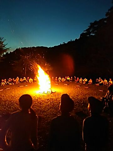 キャンプファイアーがはじまりました。火を囲んで歌やゲームで楽しく活動しています。