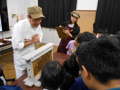 梅田ミツバチプロジェクトの皆様をお招きし、ミツバチについて楽しく学びました。約20万種類のハチの中で、はちみつを作るのはわずか9種類だけという驚きの事実や、1匹のミツバチから採れるはちみつがティースプーンの先ほどの量しかないことなどを、クイズを交えて教えていただきました。