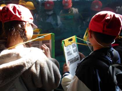 ワクワクした表情で見学のスタートです。今回はグループで行動し、大きな水槽に泳ぐ海の生き物を興味深そうに観察していました。見つけたことをワークシートに丁寧に書き込む姿や、「海遊館、めっちゃ楽しい!」という言葉から、楽しみながら学ぶ意欲がよく伝わってきました。