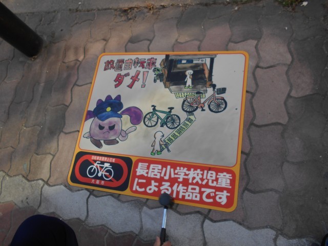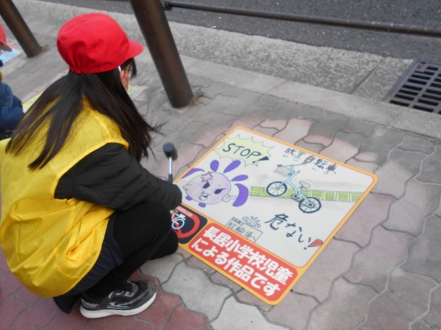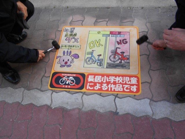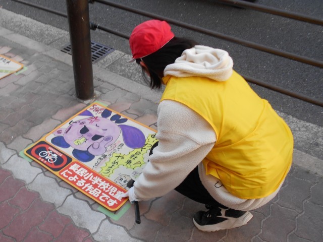 区役所に応募した作品の中から、路面に貼り付けるシートとして、本校から5作品が選定されました。子どもたちは、区長をはじめ区役所の皆様、町会長の方々、保護者の皆様とともに、長居交差点北東側で貼り付け作業を行いました。思いを込めて描いた絵が地域の方々の目に触れ、放置自転車について考えるきっかけになることを願っています。