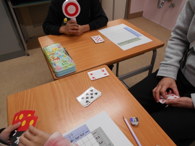 例えば、漢字の学習では、文字にイラストを添えて意味をイメージしながら覚える工夫をしています。形や成り立ちを視覚的にとらえることで、理解がより深まります。また、平面図を立体に組み立てるブロック教材に取り組み、楽しみながら空間のとらえ方を広げています。九九の学習では、トランプを使い、出てくる数字の偶然性を楽しみながら練習しています。ゲーム感覚で繰り返すことで、答えをすぐに言える力へとつなげています。