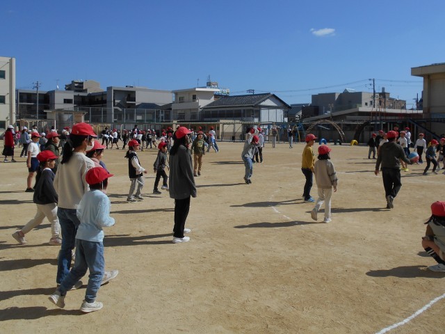 高学年が投げる速いボールを上手によけたり、思い切って受け止めたりする姿も見られ、運動場は大きな歓声に包まれました。上級生が下級生に声をかける場面もあり、たてわりならではのあたたかな交流が広がりました。これからも、みんなで活動する楽しさを大切にしていきます。