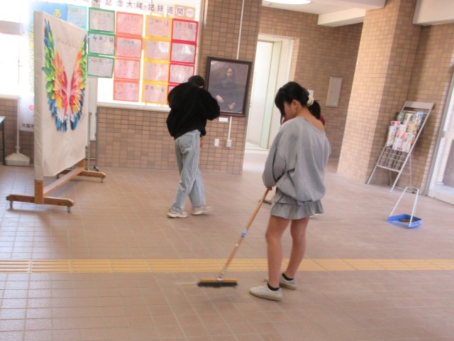 廊下の壁や更衣室、ロッカーの中など、普段はなかなか手の届きにくい所まで、友だちと声をかけ合いながら丁寧に掃除していました。これまでの感謝の気持ちを込めているような、温かな時間でした。