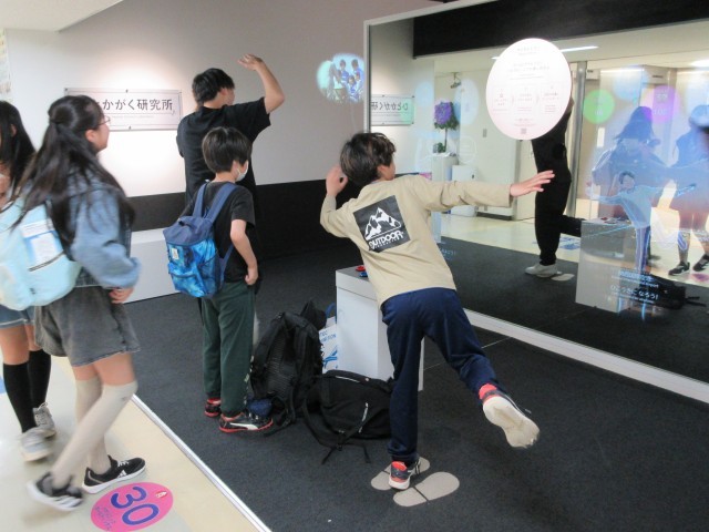 見学時間をたっぷりと取ることができたため、気になる展示に何度も挑戦したり、ボタンや装置を操作しながら仕組みを確かめたりする姿も見られました。学校でもグループで解決するワークシートを用意しており、協力して課題の解決に取り組む姿も見られるなど、6年生らしい主体的な学びの姿が感じられました。