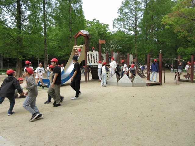 昼食は、靱公園でとりました。青空が広がるよい天気のもと、友だちと輪になって食べるお弁当は、いつも以上においしく感じられたようです。食後には楽しみにしていたおやつタイムもあり、笑顔あふれるひとときとなりました。その後は、遊具のある場所で体を動かし、友だちと声をかけ合いながら元気に遊ぶ姿が見られました。