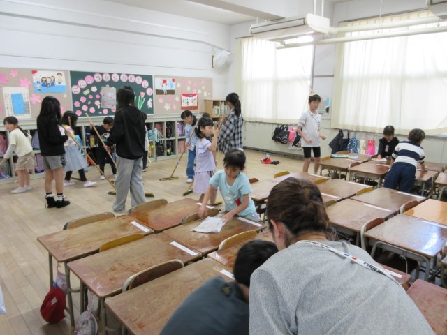 入学して間もない1年生も、掃除に取り組んでいます。一生懸命に、教室やろうかをきれいにしています。6年生は、掃除の時間にも手伝いに来てくれています。ほうきの持ち方やぞうきんの使い方をやさしく教えたり、い...