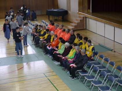 25日(月)に講堂で行いました。子どもたちからはリースと歌を、はぐくみネット事業とPTAからは花などを贈りました。朝の見守り活動、本当にありがとうございます。