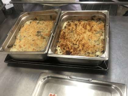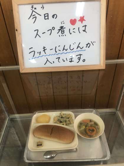 今日の給食は、スープ煮・ほうれんそうのグラタン・白桃(缶)・パン・牛乳です。今日は、スープ煮に星とハートのラッキーにんじんが入っていました。来月のラッキーにんじんはクリスマスバージョンになります。どんな形のにんじんが入っているか楽しみにしていてくださいね。