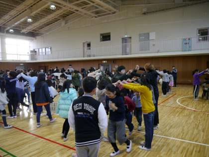 くぐり抜けゲームをしました。捕まった人が捕まえる人に加わっていくので、思うようにくぐり抜けるのが難しそうでした。