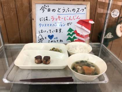 今日の給食は、あげシューマイ・とうふのスープ・ツナとチンゲンサイのいためもの・ご飯・牛乳です。今日のとうふのスープには、クリスマスバージョンのラッキーにんじん第二弾が入っていました。今日はベルとハートの型抜きにんじんです。