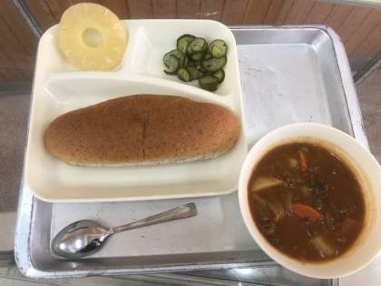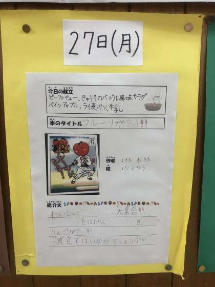 27日の給食はビーフシチュー・きゅうりのバジル風味サラダ・パインアップル缶・ライ麦パン・牛乳です。今日の給食図書はパインアップル缶にちなんで、果物がたくさん登場する「フルーツがきる!」です。給食には季節の果物がたくさん登場します。季節を感じながら食べてください。今日は2学期の食べのこしゼロデーの表彰状の授与式でした。代表で1-3の代表に表彰状が授与されました。これからも食べ残しゼロを目指して食べましょう。