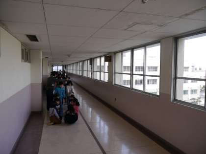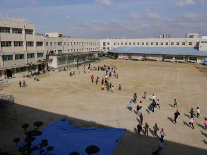 地震が発生し机の下で身を守った後、運動場に移動しました。その後、津波に備えて3階や4階に移動しました。最後に校長先生が、今後、大阪に地震が起こる可能性があるので、その危機意識を持ち続けることが大切です、と話をしました。