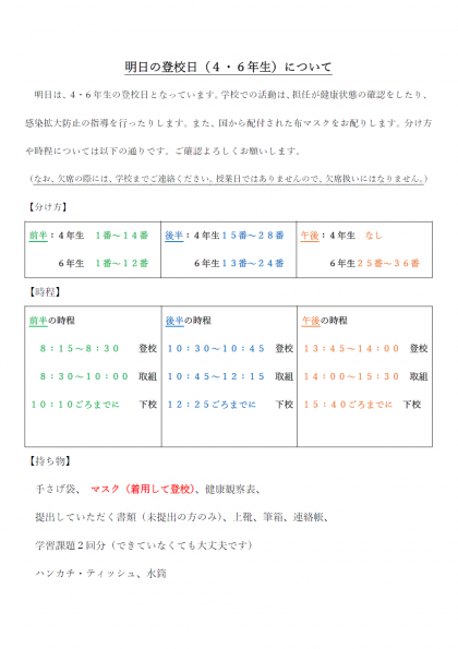 明日は、4・6年生の登校日となっています。学校での活動は、担任が健康状態の確認をしたり、感染拡大防止の指導を行ったりします。また、国から配付された布マスクをお配りします。分け方や時程については以下の通りです。ご確認よろしくお願いします。