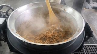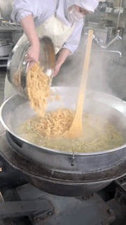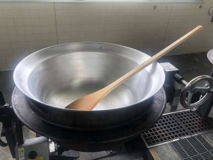 回転がまは、みそ汁やカレーライスなどの大おかずを作るために毎日使います。直径90cmくらいあります。また、回転がまの中身をを混ぜるしゃもじは、とても大きくて120cmくらいあります。120cmというの教室の黒板のたての長さくらいです。1つのかまで、カレーライスは300人分くらい作ることができます。混ぜるのはとても重たくて筋肉痛になります。