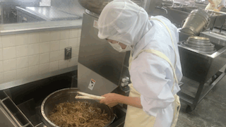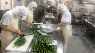 フードスライサ—は野菜を切る機械です。依羅小学校では、依羅小学校と我孫子南中学校合わせて1000人分を作っているので、機械で切っても味や風味が変わらない野菜は機械で切っています。左の動画は、ごぼうのささがきをしているところです。機械で切ることができなかったり、味が変わってしまったりする野菜は手で切っています。右の写真はみそ汁のねぎを切っているところです。