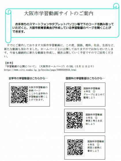 すでにご案内しております大阪市学習動画に、この度、国語、理科、社会、生活など、新たな動画も加わりました。ホームページ上に公開しておりますのでお知らせいたします。