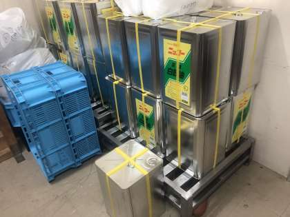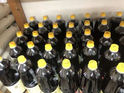 では、ここで調味料クイズです。右はしの写真は揚げ物に使う油の写真です。1缶は約18L(500mlのペットボトル36本分)で約16kgです。1回の揚げ物では何缶使うでしょうか?答えは後日お知らせします。