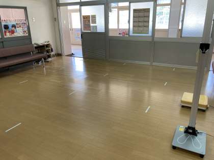 またプライバシーに配慮したうえで換気を十分に行い、床面に待機位置を明示し児童間の距離を確保しています。