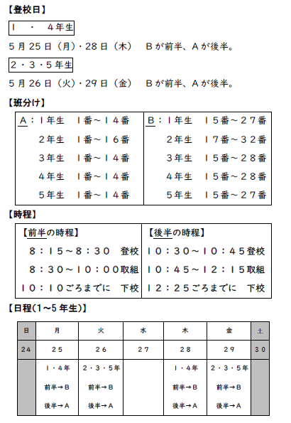 【1〜5年生】 5月25日(月曜日)〜29日(金曜日)の登校日について