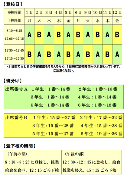 ・この期間は全学年一斉の分散登校することとしており、教室では授業を行っているため、教職員や教室(居場所)の確保が難しい場合が想定されますので、家庭等でのお子様の監護が可能な方はできる限り家庭等での監護にご協力をお願いします。