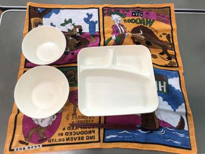 昨日のお手紙でお知らせしました給食用ナフキンの写真です。ナフキンの上にプレートのお皿・小碗・大碗・牛乳・おはしなどをのせて使用します。毎日持ち帰りますので、衛生面にご配慮をお願いします。