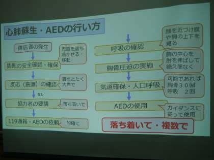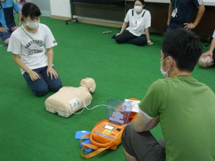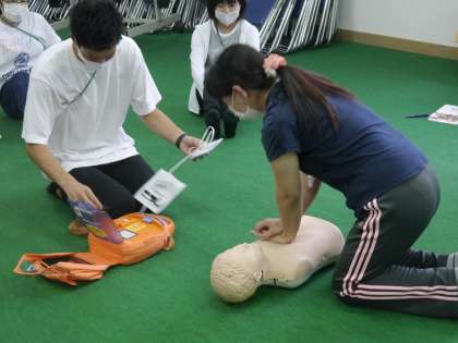 人形と訓練用のAEDを使って、実技訓練をしました。心肺蘇生の方法は時がたつにつれて少しずつ変化しますので、こういった毎年の訓練が大切だと感じています。