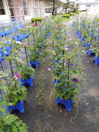 ◆アサガオの花がたくさんさいています。むらさき色やピンク色の花がたくさんさいています。つるも長くのびています。まっすぐのばすと子どもたちの身長と同じぐらいのびました。