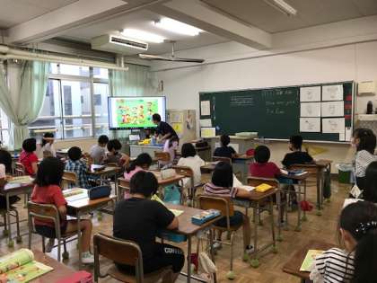 外国語活動の様子です。テキストを使った学習に、子どもたちは楽しく取り組んでいます。今日は、英語の挨拶の仕方を学習しました。