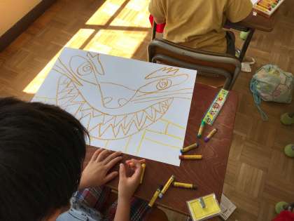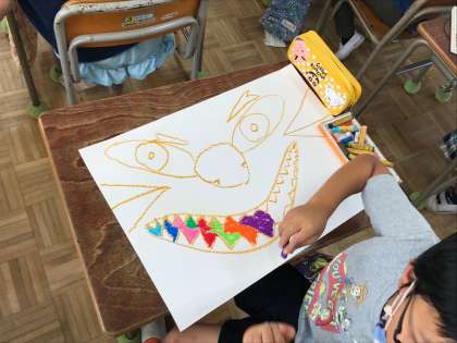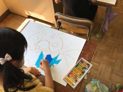 絵本「八方にらみねこ」の読み聞かせをしました。絵本には、大きな目をぐうっと開いた、迫力のあるねこの顔が描かれています。お話を参考に絵を描いていく学習に取り組みました。みんな画用紙いっぱいに顔を描きました。次は、カラフルに色をつけていきます。また、経過を載せていきますので、楽しみにしていてください。