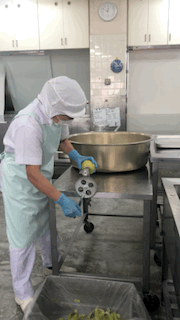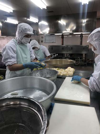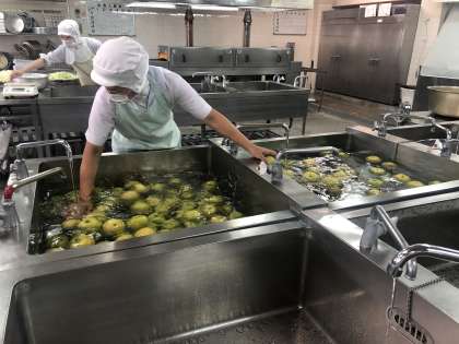 まだまだ暑い日が続いていますが、9月の給食には秋の味覚がたくさん登場します。なしは、きれいに洗ったあと、皮をむいて、等分します。9.10.11月にはたくさんの秋の味覚が登場します。さがしてみましょう。