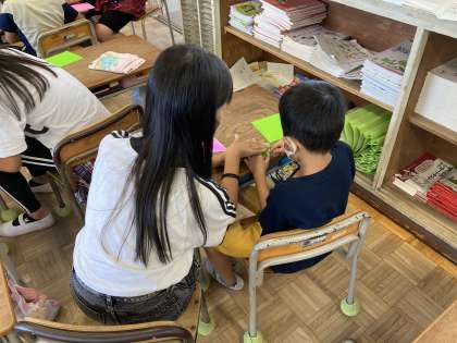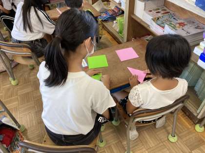 今日は、1年生と一緒に鶴を折りました。密にならないよう、1年生の教室と6年生の教室を使い取り組みました。久々の1年生との交流に楽しみながら、丁寧に教える姿が素敵でした。折り鶴ができて、うれしそうにしている1年生を見て、6年生もうれしそうにしていました。