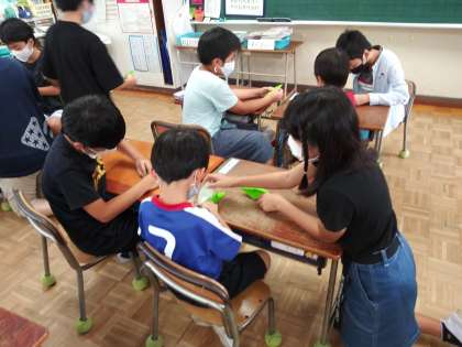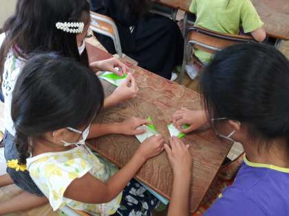 6年のお兄さんやお姉さんは1年生に千羽鶴の折り方をていねいに、やさしく教えてくれました。1年生は少し緊張していましたがやさしく兄さんやお姉さんが教えてくれたので、心を込めて千羽鶴を折ることができました。6年生は10月1日から修学旅行で広島の原爆ドームを訪れます。そこで、この千羽鶴を平和の祈りを込めて奉納します。