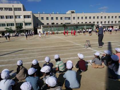 2年生から6年生までのお兄さんお姉さんと一緒に応援合戦の練習をしました。